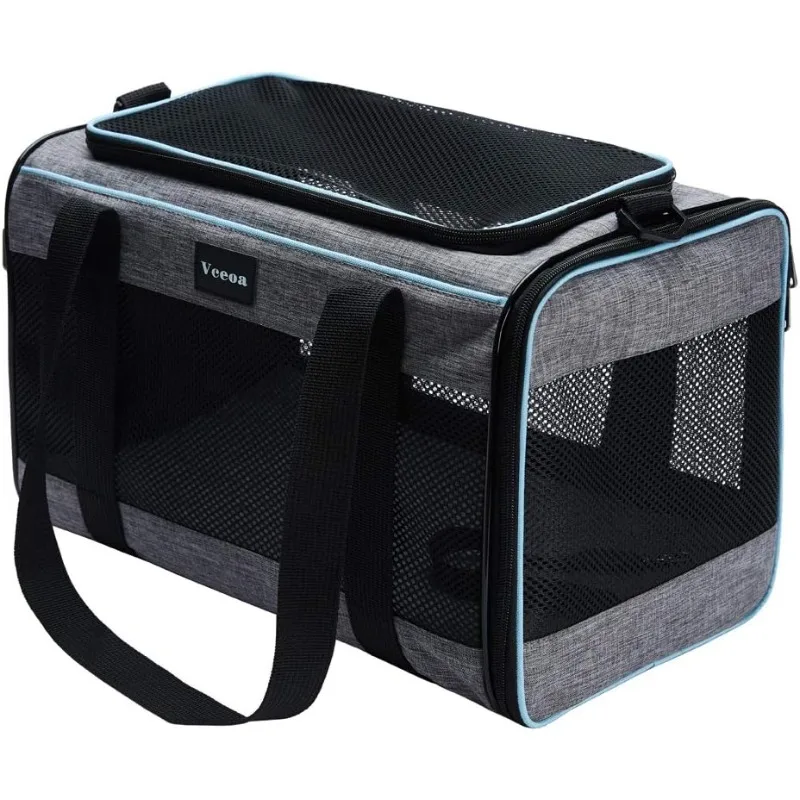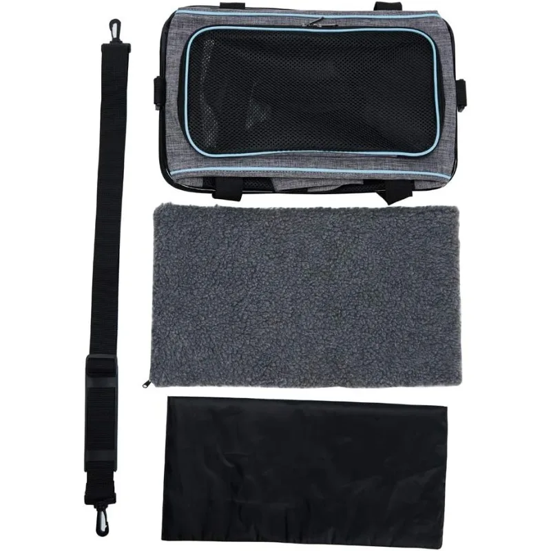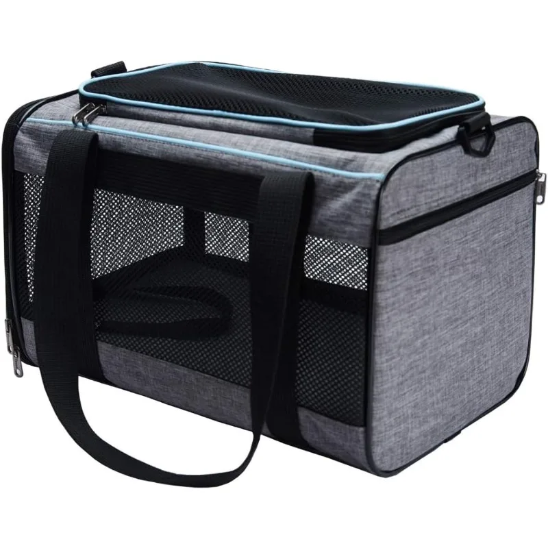 - Mesh windows for ventilation, top and side entry with locking zippers for safety. Carrying handles, adjustable shoulder strap which can also be used as seatbelt, and back strap can fasten the pet carrier to your luggage.